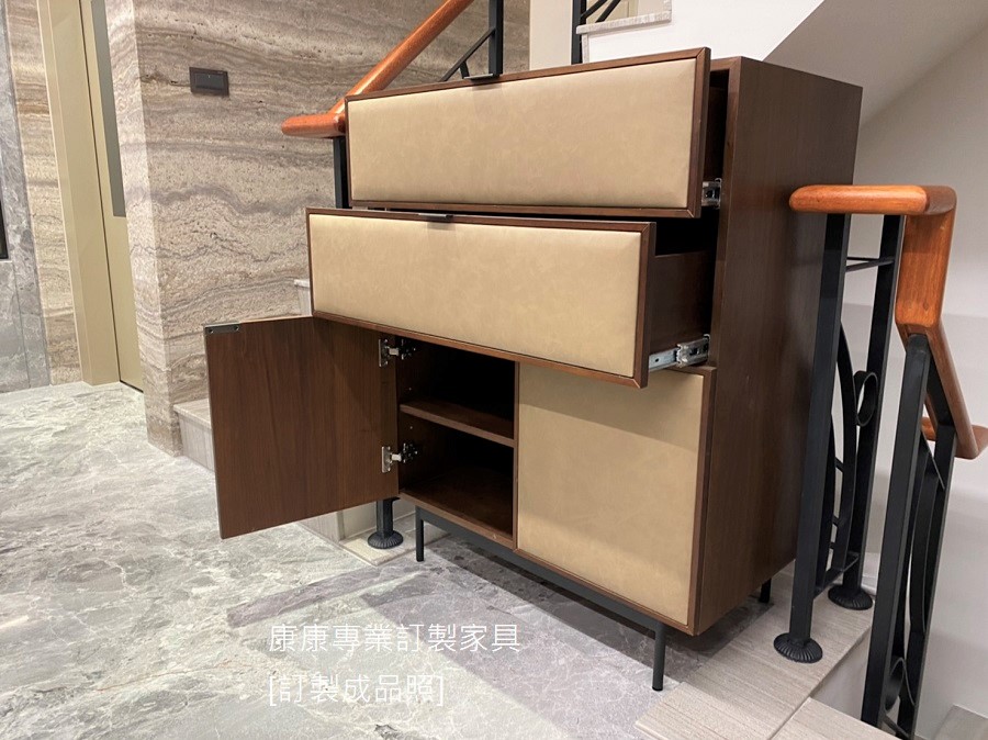 材質: 櫃體 貼胡桃木皮 /面繃人造皮/黑鐵腳
