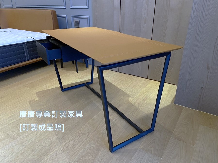 材質:桌面-再生馬鞍皮; 腳座-黑鐵